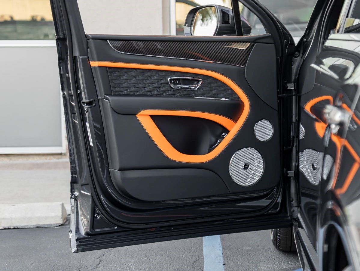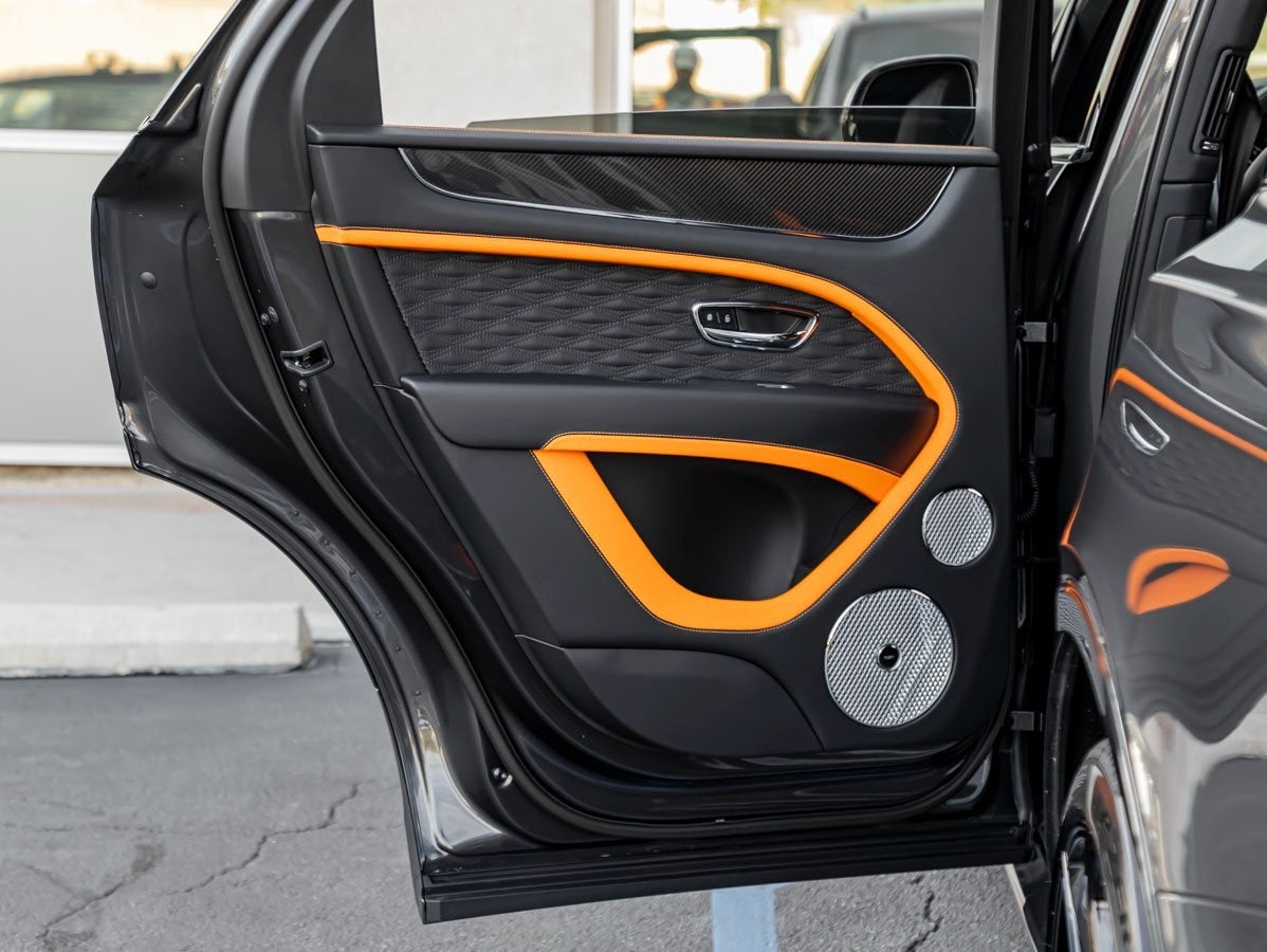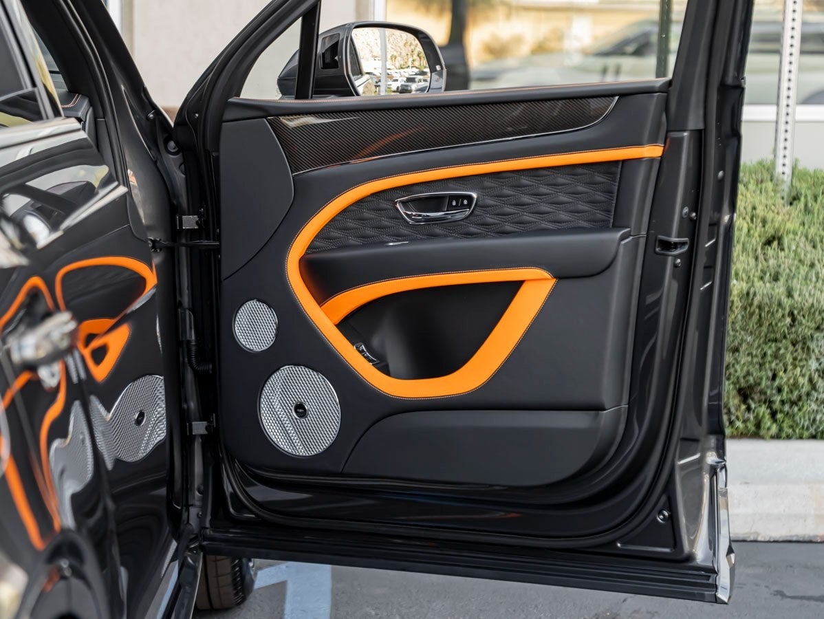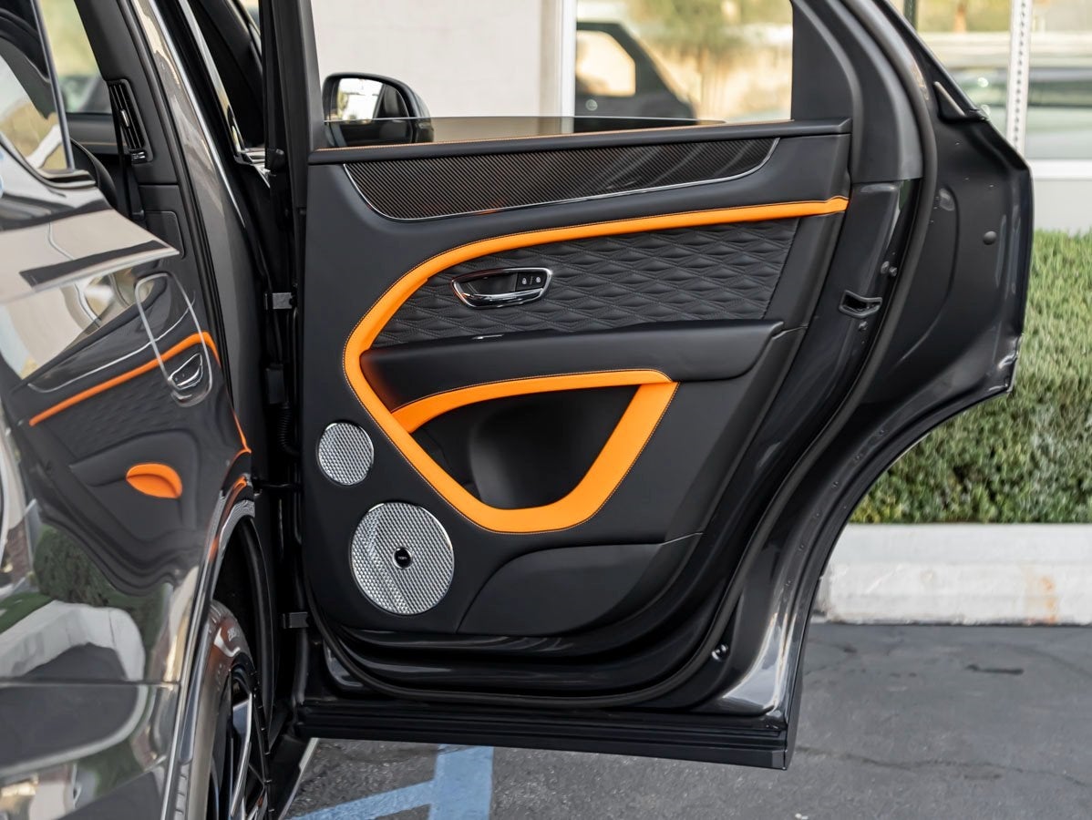 The Bentayga Speed commands attention with its sleek Anthracite finish, complemented by the bold Bentayga Blackline Specification, 23 Dynamic Specification Black Painted Wheels, and aggressive Bentayga Styling Specification with Accent. The look is further elevated by the Black Roof and Roofrails, Self Leveling Wheel Badges by Mulliner, and dramatic Animated Welcome Lamps by Mulliner.