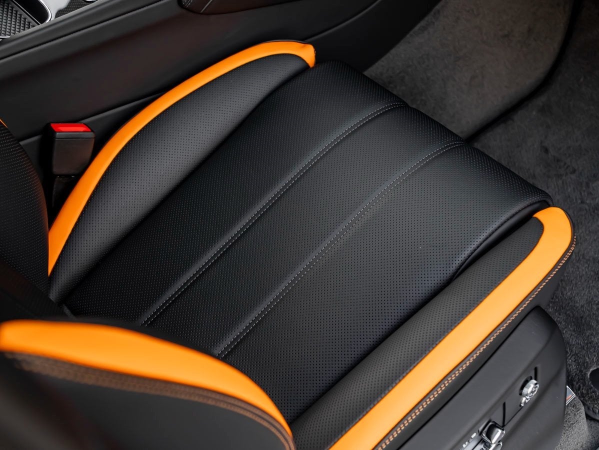 Inside, the meticulously crafted Black/Mandarin interior features Contrast Stitching and the premium Leather Specification. Carbon Fibre Fascia, Center Console, and Door Waistrails add a motorsport flair, while Deep Pile Overmats to Front and Rear and customizable Mood Lighting enhance cabin luxury. Rear Acoustic Privacy Glass ensures a serene environment, and the Front Seat Comfort Specification provides massage, ventilation, and multi-way adjustments for an unparalleled driving experience. Audiophiles will appreciate the exceptional Naim for Bentley sound system.