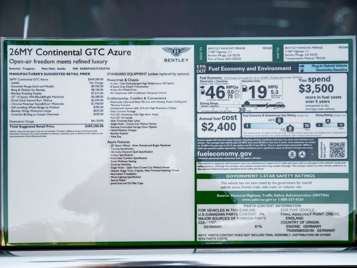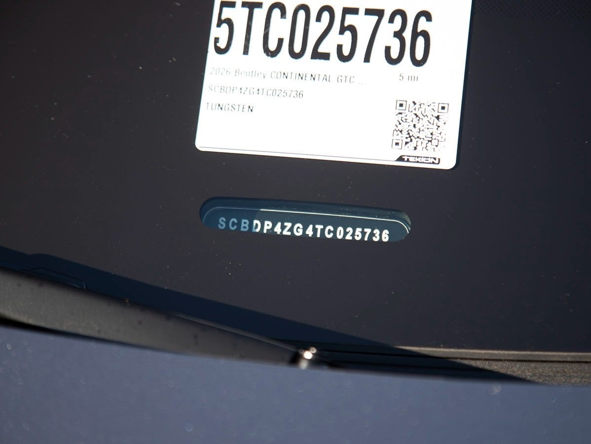 The 2026 Bentley Continental GTC Azure blends iconic Bentley styling with exclusive Azure design cues focused on well-being and comfort. The 22 10-Spoke Wheels Black and Bright Machined make a bold statement, while the Self Levelling Wheel Badge by Mulliner and Bentley Wings Welcome Lamps enhance the vehicles bespoke presence. The Extended Range Solid and Metallic exterior finish in Tungsten Metallic ensures this configuration stands out with understated sophistication.