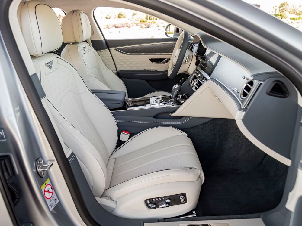 Step inside and the Linen interior welcomes you with an atmosphere of tailored craftsmanship and contemporary elegance. The cabin is enhanced by Contrast Stitching and Seat Piping, Contrast Binding to Carpet Overmats, and luxurious Deep Pile Overmats Front and Rear. The Heated Duo-Tone 3-Spoke Steering Wheel adds both comfort and style, while the Leather Specification, Bentley Rotating Display, and Diamond Brushed Aluminum Dark Tint Finish create an interior environment that is both indulgent and technologically advanced.