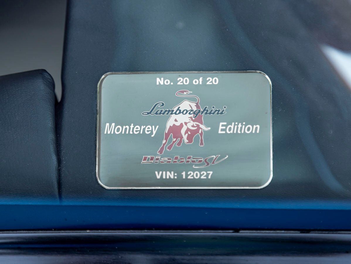 1998 Lamborghini Diablo SV Monterey Edition #20/20. VIN ZA9DU21BXWLA12027, 22,747 miles, 5.7L V12 with 5-speed manual. A rare, driver-focused SV with iconic styling and collectible provenance. Call for price & availability.