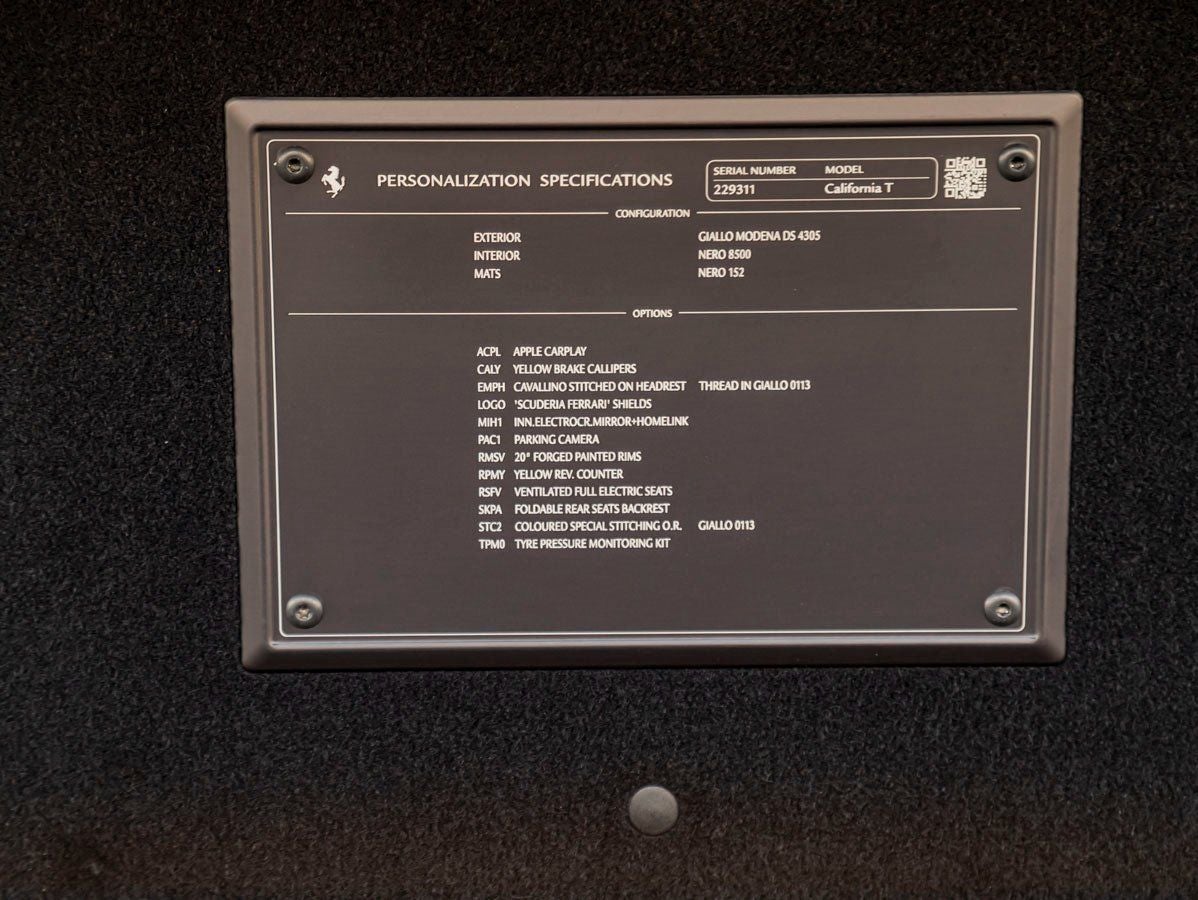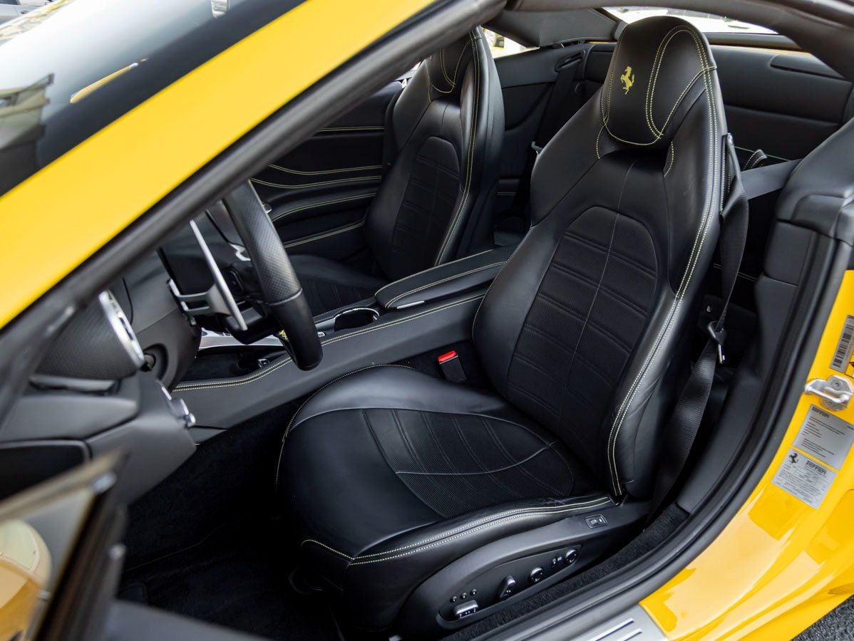 Draped in vibrant Giallo Modena, this California T commands attention with its sculpted body lines and timeless Ferrari silhouette. The retractable hardtop seamlessly transforms the car from an elegant coupe to an exhilarating convertible in seconds, offering versatility without compromise. 20 Forged and Painted Wheels complement the cars athletic stance, while striking Yellow Brake Calipers provide a bold visual accent behind the wheels. The Scuderia Ferrari Shields proudly displayed on the front fenders further emphasize its racing pedigree and unmistakable identity.
