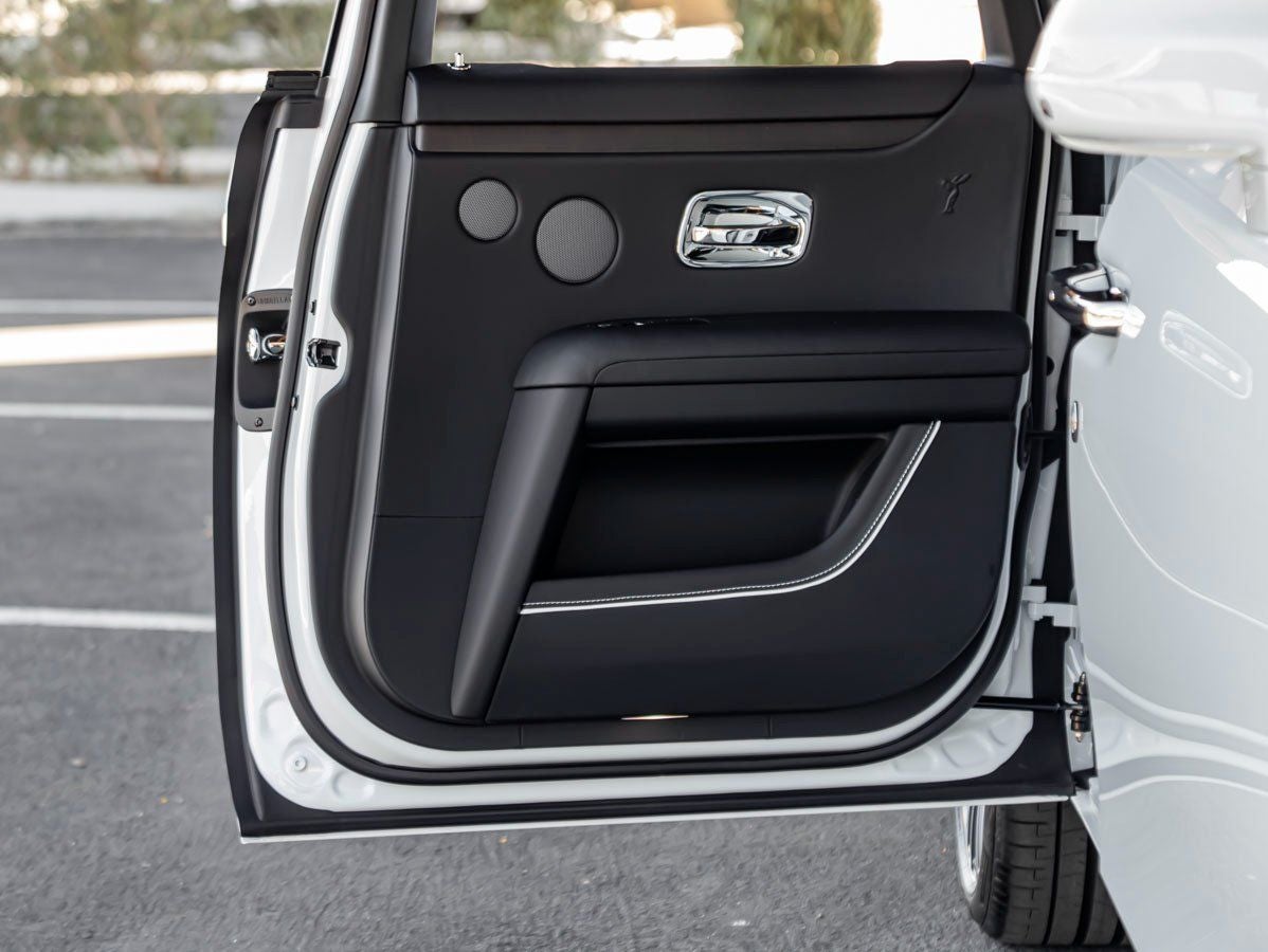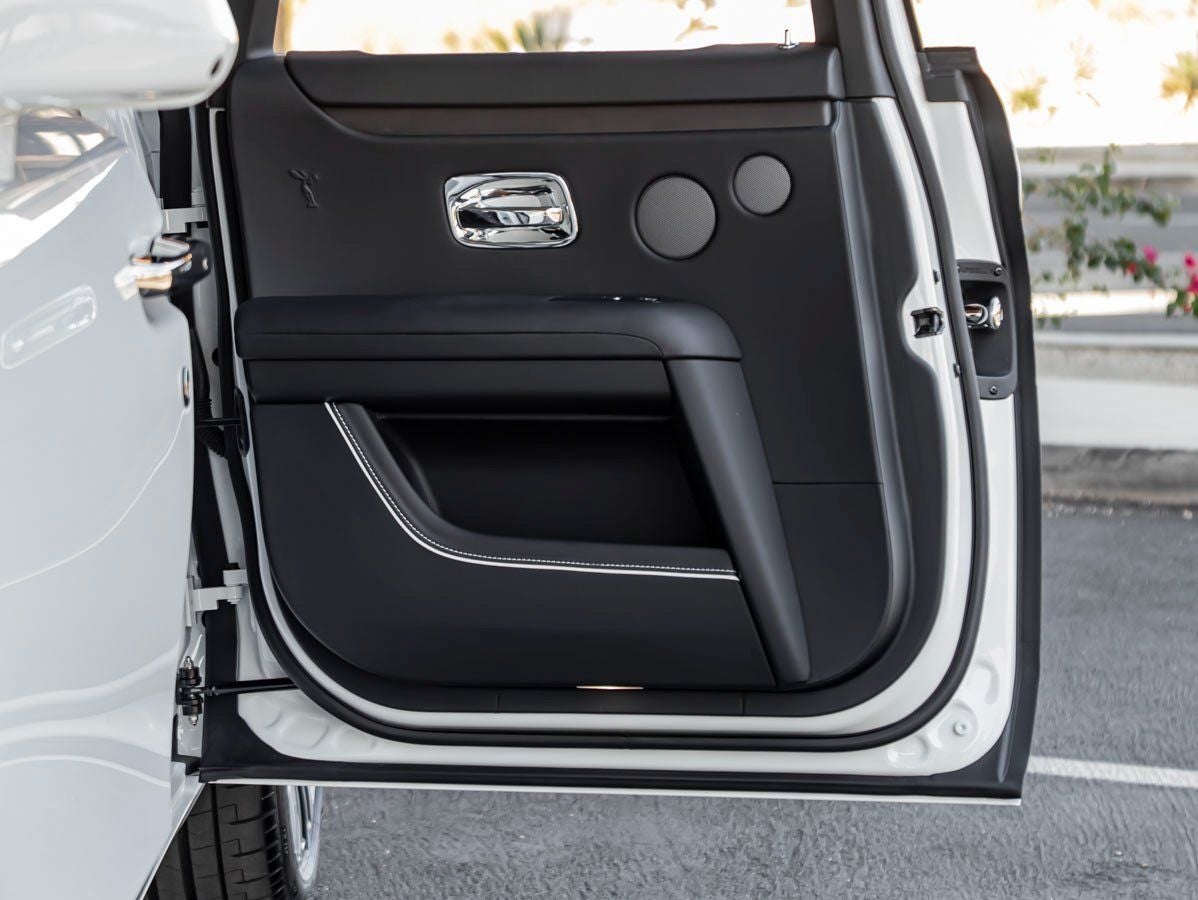 Step inside to experience a sanctuary of serenity and bespoke craftsmanship. The Black leather interior is artfully contrasted by Arctic White accents, including RR Monograms embroidered on all headrests in Arctic White, Colored Stitching in Arctic White, and Extended Piping in Arctic White, creating a harmonious and tailored ambiance. The Spirit of Ecstasy embossed on the doors serves as a refined reminder of the marques heritage.