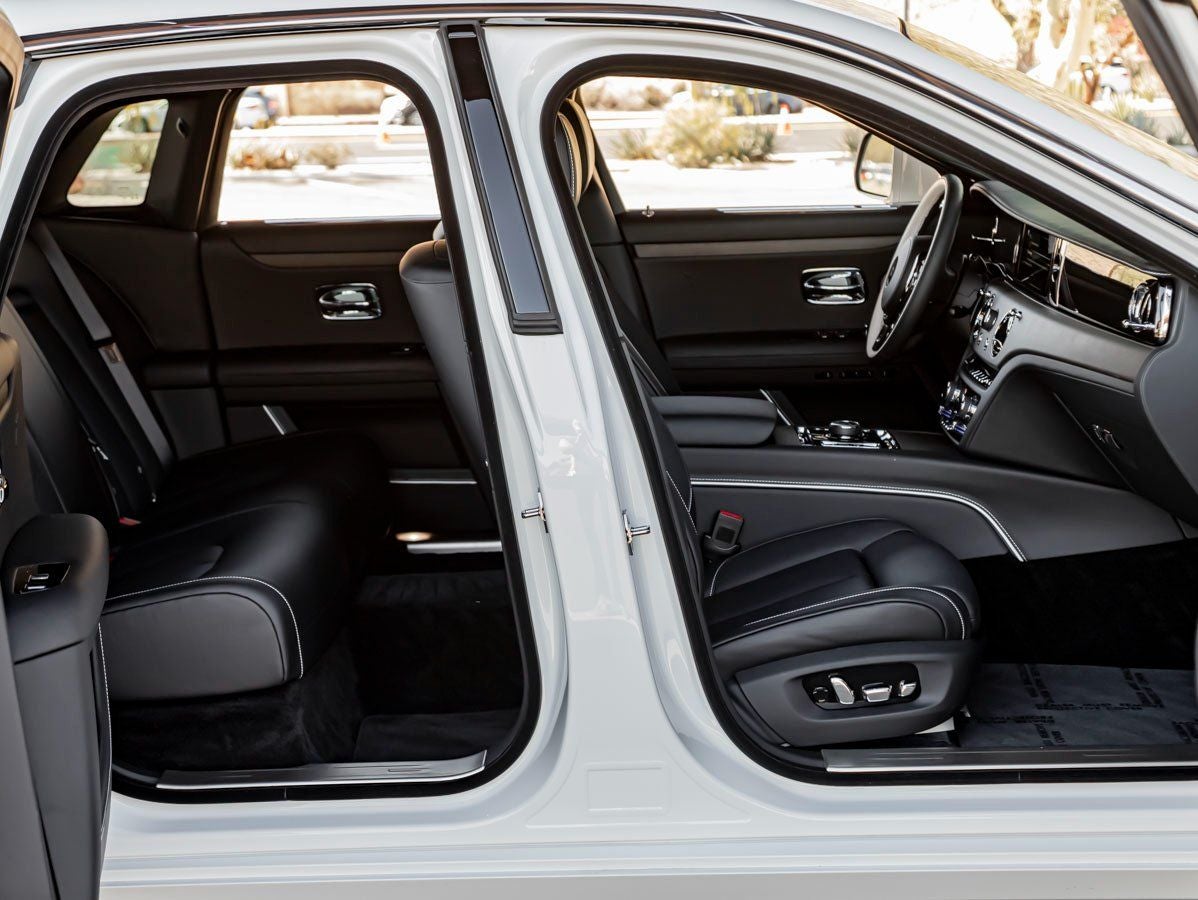 Draped in luminous Arctic White, the Ghosts commanding presence is both graceful and authoritative. Its illuminated Pantheon grille and iconic Spirit of Ecstasy lead the way with quiet confidence, while its clean, architectural lines reflect Rolls-Royces commitment to modern minimalism. Subtle bespoke details, including Wheel Centers Matched to Wheel, enhance the vehicles cohesive and sophisticated aesthetic.