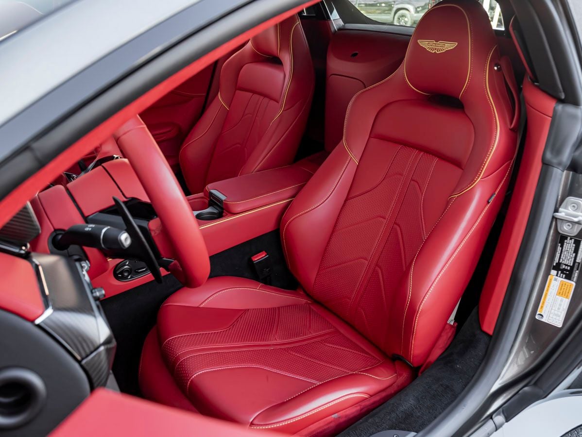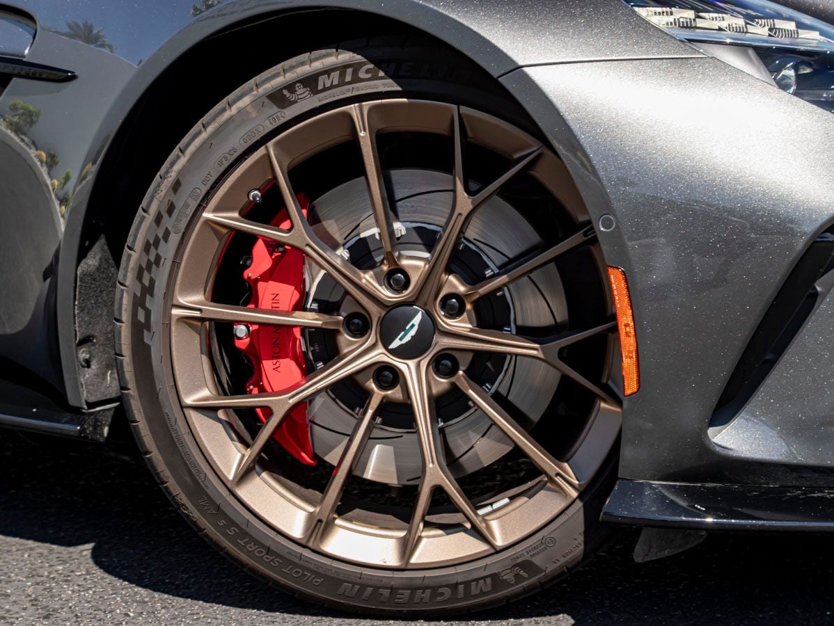 The Vantage Roadster commands attention with its athletic stance, sculpted body lines, and unmistakable presence. The Signature Metallic Magnetic Silver paint enhances its sleek and aggressive profile, while the black vaned front grille, black upper and lower packs, and dark chrome jewelry accents add a modern and performance-driven edge. Completing the look are distinctive 21 Y-spoke forged satin copper bronze wheels, smoked tail lamps, and bold red brake calipers, delivering a refined yet commanding road presence.
